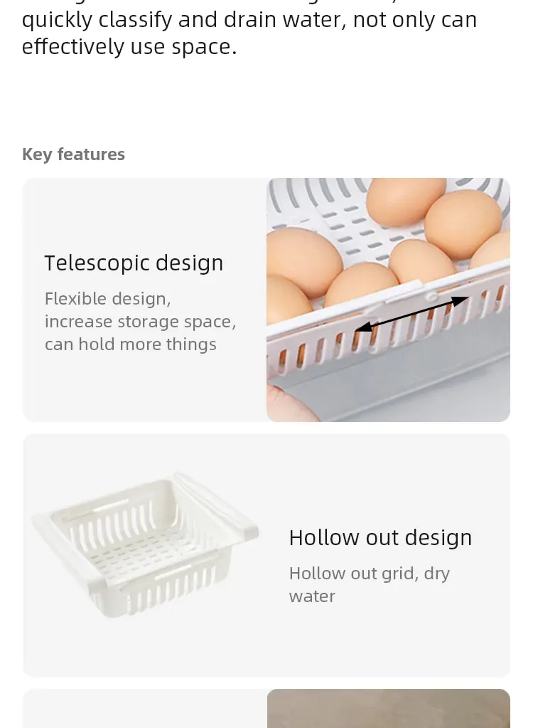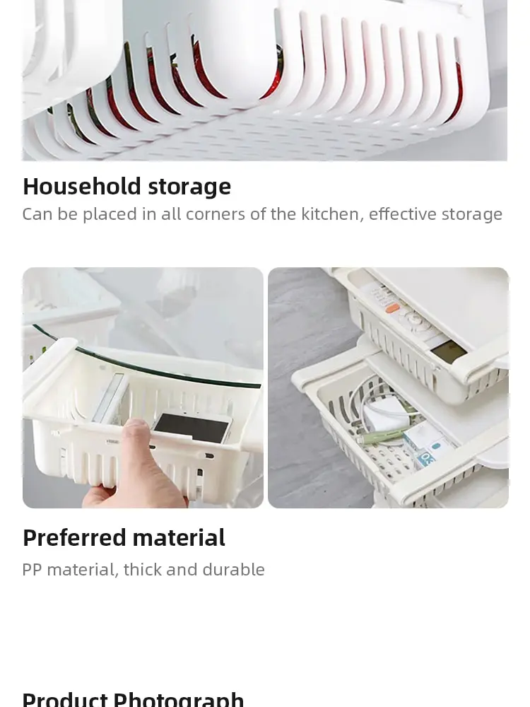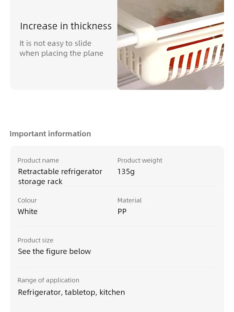 Estas bandejas organizadoras son perfectas para colgar en el refrigerador y crear espacio adicional para tus alimentos. Hechas de plástico resistente y duradero, estas bandejas soportan hasta 5 kg, asegurando que puedas almacenar una variedad de productos sin preocupaciones.